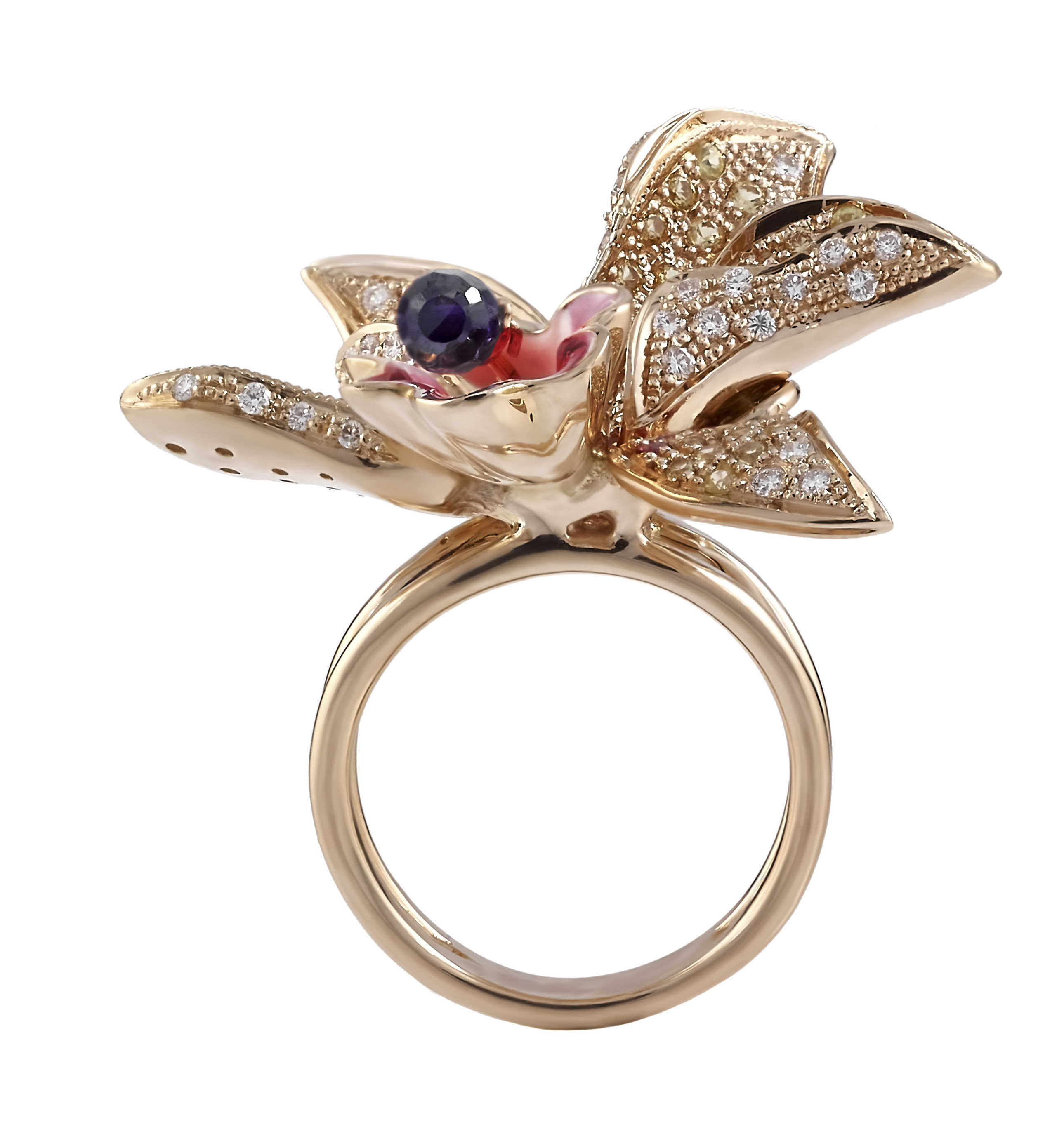 | نوع و وزن جواهرات | برلیان سفید پاک ۰.۳۹ قیراط .یاقوت زرد و قرمز ۱.۵۴ قیراط .آمیتیس ۱.۲۳ قیراط |
